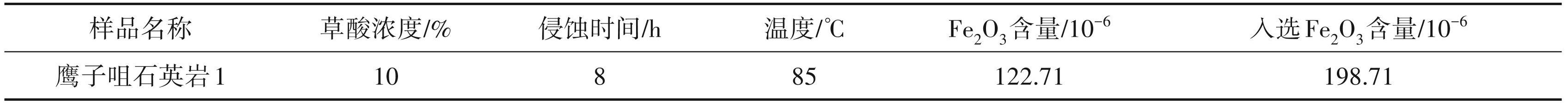 对鹰子咀石英岩 1试样-0.6+0.1 mm粒级通过三段1.4 T磁选后,采用十二胺反浮云母、采用HK-1、HK-2 反浮长石、采用石油磺酸钠反浮铁杂质后的精矿进行酸浸试验,试验条件为:10% 草酸溶液, 85℃静置8 h。精矿Fe2O3含量分析如表7所示。由表7表明,鹰子咀石英岩 1 试样经磁选—浮选—草酸酸浸后,Fe2O3含量达不到光伏超白砂的质量要求 (Fe2O3≤100×10-6),但较磨矿—磁选—浮选工艺有明显提升。由于鹰子咀石英岩1试样石英颗粒粒径主要分布在0.1~0.4 mm,在-0.6+0.1 mm粒级中,有部分石英颗粒没有单体解离,存在于石英颗粒间的杂质矿物难以通过浮选浮出和弱酸浸出。