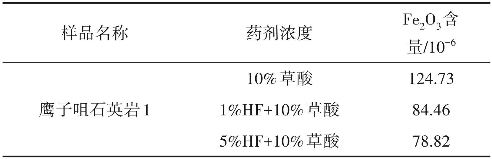 (4)混合酸液在氢氟酸的作用下,可促使石英砂中残余白云母、氧化铁膜和包裹体等杂质不断溶蚀析出,将铝硅酸盐晶格破坏后,实现杂质元素的有效去除(林康英等,2012;银锐明等,2014;吴逍等,2015),研究了酸质量分数、酸浸温度和时间对石英砂提纯效果的影响,为强化石英晶界杂质去除效果,特别在混合酸中适当提高了 HF 比例(吴逍等,2017)。本文在10%草酸基础上分别添加1%HF 和 5%HF 后,精矿中 Fe2O3含量分别降至 84.46×10-6 和78.82×10-6,可达到光伏超白砂的质量要求(Fe2O3 ≤100×10-6)。