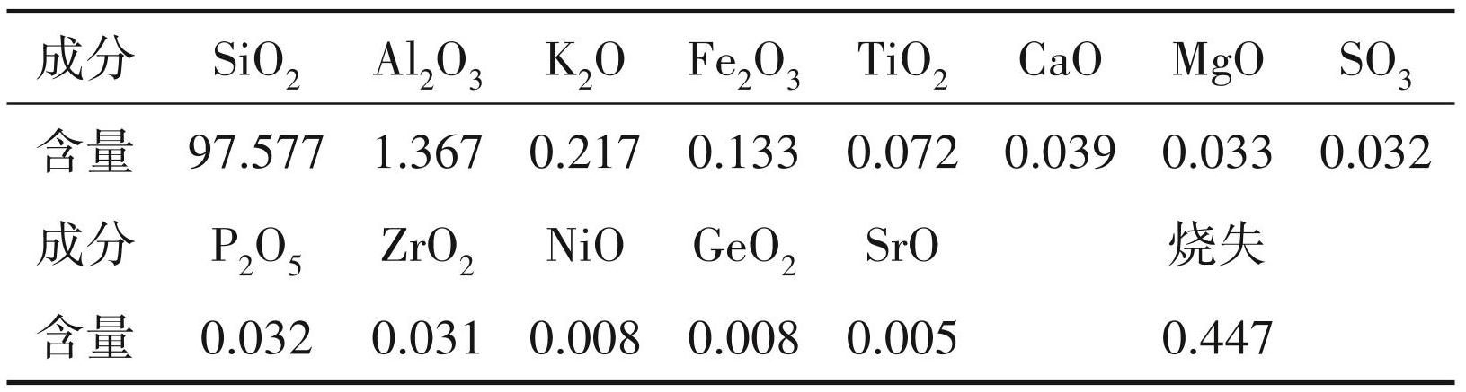 由鹰子咀石英岩 1 试样的化学成分分析表明 (表2),鹰子咀石英岩 1 石英矿的主要成分为 SiO2 97.577%, Al2O3 1.367%, K2O 0.217%, Fe2O3 0.133%,其余组分含量小于0.1%。