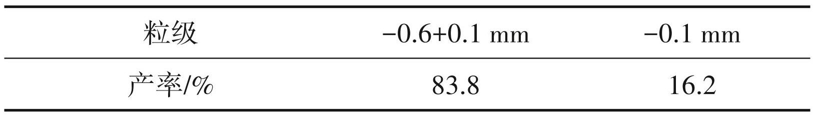 对鹰子咀石英岩1试样进行磨矿试验。磨矿采用三辊四筒磨矿机进行闭路磨矿,磨矿条件为:铁棒介质,磨矿浓度60%,磨矿时间2 min,磨矿后分级返回多次。磨矿时带入的含铁杂质一般以游离铁或矿石表面粘附铁的形式存在于物料中,通过后续工序去除。磨矿产率数据如表4所示。从表4可以看出,-0.6+0.1 mm 粒级产率大于 80%。对鹰子咀石英岩 1 试样-0.6+0.1 mm 进行磁选试验,磁场强度 1.4 T,磁选介质为细钢棒。共进行 3 段磁选,磁选产率数据及结果如表5所示。由表5表明,鹰子咀石英岩 1 磁选后,Fe2O3 含量大幅降低,由原矿 Fe2O3含量 1330×10-6 降低至 240.59×10-6,说明磁选效果显著,但仍未达到光伏超白砂(Fe2O3≤100×10-6) 的质量要求。