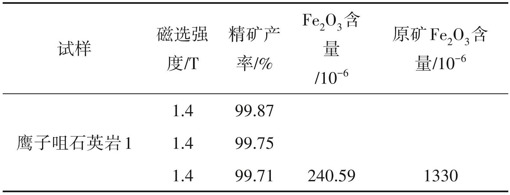 (2)去除磁性杂质及加工过程中混入的机械铁主要通过磁选法,尤其强磁选工艺可最大限度地去除赤铁矿、褐铁矿、电气石和绿帘石等弱磁性矿物 (岳丽琴,2014;李晓慧等,2023)。考虑对矿物的纯度和回收率要求高,本次采用三段强磁选对湖北宜都鹰子咀东矿段石英砂岩试样除铁效果显著,可使原矿Fe2O3含量1330×10-6 下降为240.59×10-6。确定磁选工艺应作为本矿石选矿工艺流程之一。