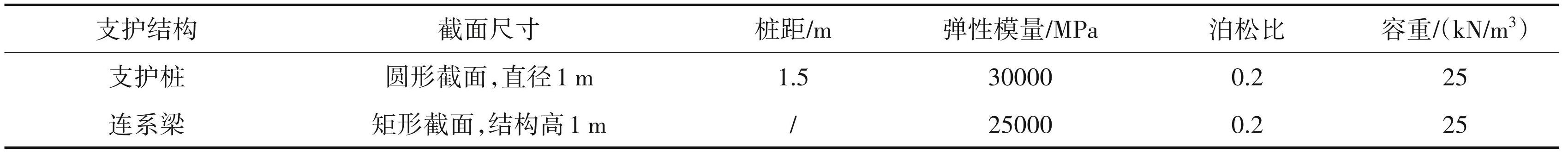 该剖面支护形式为双排桩支护。支护桩桩径为1 m,支护桩总长为23 m,桩中心间距为1.5 m,两排桩排距为4 m,。在模拟中,使用梁单元来模拟该支护结构。梁单元能够较好地反映桩的抗弯和抗剪性能,从而为分析支护结构的受力和变形提供较为准确的结果。中间联系梁也采用梁单元模拟。各支护构筑物参数如表2所示。