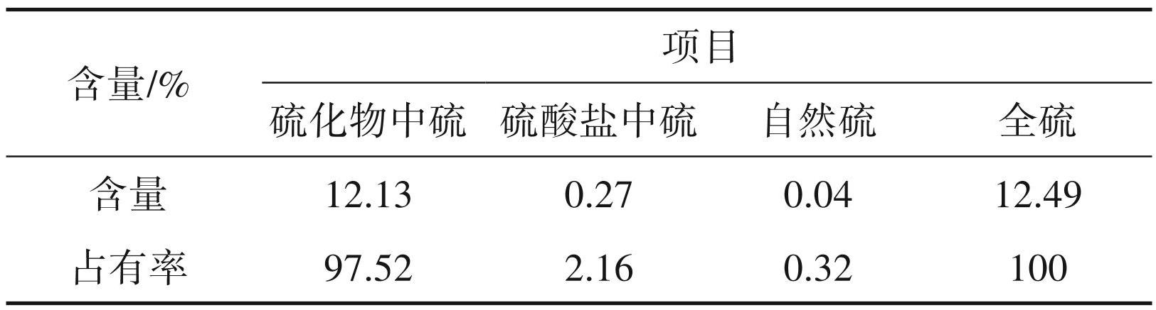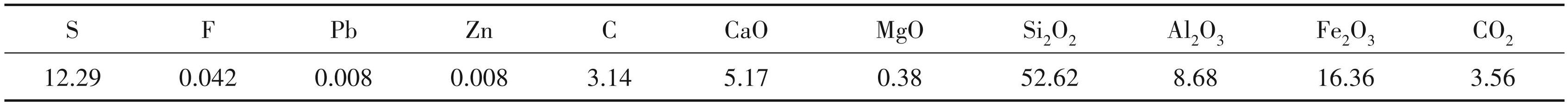 由硫铁矿的化学成分分析结果可知(表2), Fe2O3、S 作为原矿中目标元素,质量分数分别为16.36%,12.29%;硅和铝含量较高,分别为 52.62%,8.68%,表明矿石中含有一定量石英和含铝硅酸盐矿物。由煤矿原矿的半定量全分析结果可知(表3),煤矿原矿中主要元素分别为 Si、Al、Ca、 Na、Mg等元素。由煤矿原矿物相分析结果可知(表4),煤矿中S元素只要以硫化物方式存在。