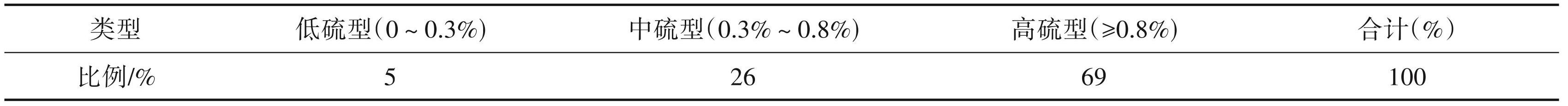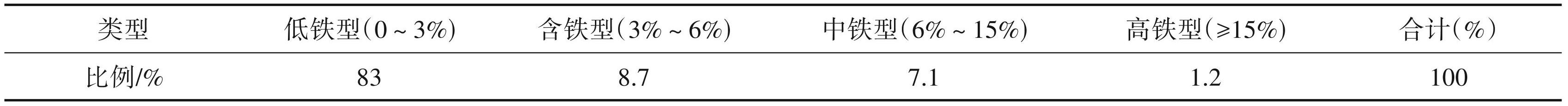 铝土矿的有益元素为铝元素,伴生元素为镓元素等,有害元素为铁和硫。矿层中铁的含量为上部低,下部高,单工程平均品位 0.40%~22.84%。依据铁含量,矿石可划分成4种工业类型(表4)。依据硫含量,矿石可划分成3种工业类型(表5)。