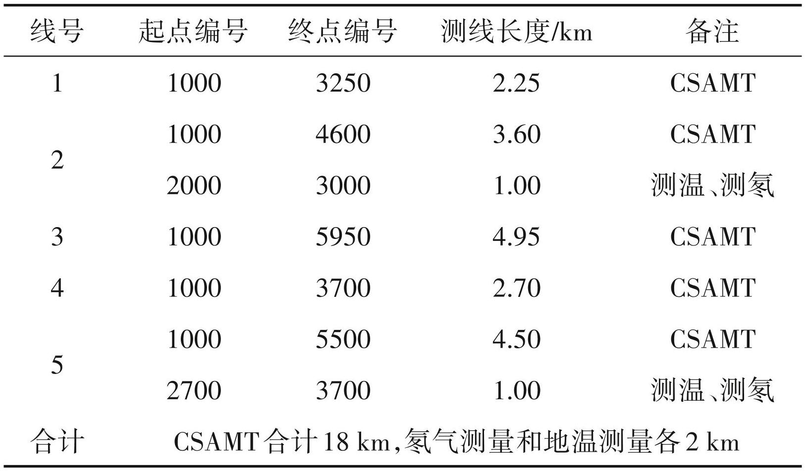 可控源音频大地电磁法(CSAMT)以其探测深度大、分辨能力高等特点广泛用于地热资源勘查领域(陈怀玉等,2020;吴姗姗等,2022)。本研究开展了 CSAMT 和地温测量、氡气测量工作,通过地质资料分析认为研究区的地热与青湖地区内深部北东向及北西向断裂有关,因此测线的布置以追索北东向和北西向断裂构造为目的。共布设北东和北西向 CSAMT测线 5条,测线总长 18 km,其中 1线、2线和3线主要是为了探测北西向断裂,4线和5线是为了探测北东向断裂;布设了 2 条氡气测量和地温测量测线,位于2线和5线上,总长2 km。各剖面坐标详见表3。