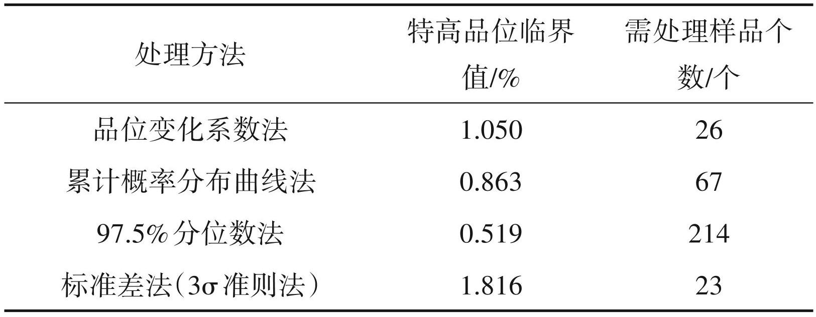 本研究针对以上常用 4 种方法进行了对比,各方法确定的特高品位原始 Mo品位下限值和需处理样品个数见表3。