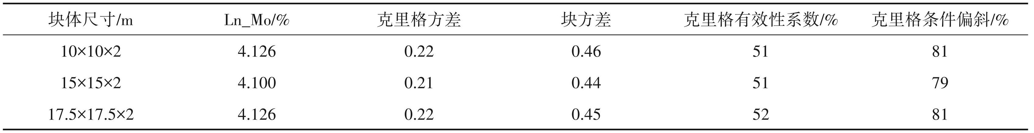 东戈壁钼矿主矿体沿走向、倾向长度基本相等,探求探明资源量的工程间距为70 m×70 m,设计台阶高度 12 m,组合样样长 2 m。本次块模型单元块标准 XY尺寸选择探明工程间距的 1/4、1/5、1/7,Z 尺寸统一选择 2 m,即 17.5 m×17.5 m×2 m,15 m× 15 m×2 m,10 m×10 m×2 m 共 3 种尺寸进行对比,采用统一估值参数进行普通克里格法估值,对比 Mo 品位、克里格条件偏斜、克里格效率等指标(表4),最终确定块体尺寸取工程间距的 1/4(17.50 m),次级块尺寸取标准块尺寸的1/2。块体模型完成后,添加矿岩类型、比重、元素品位、资源量级别、估值利用钻孔数等属性(滕正双和于红萍,2015)。