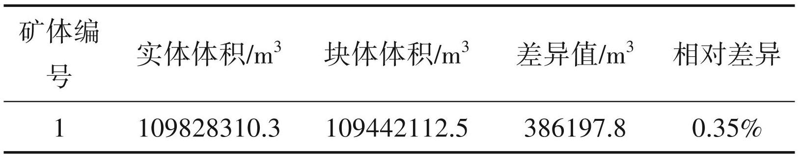 利用矿体范围的约束,求出矿体内块体的体积,与矿体的实体体积进行对比分析(表5),体积相对偏差小于 1%,表明块体模型尺寸参数设置的合理性。