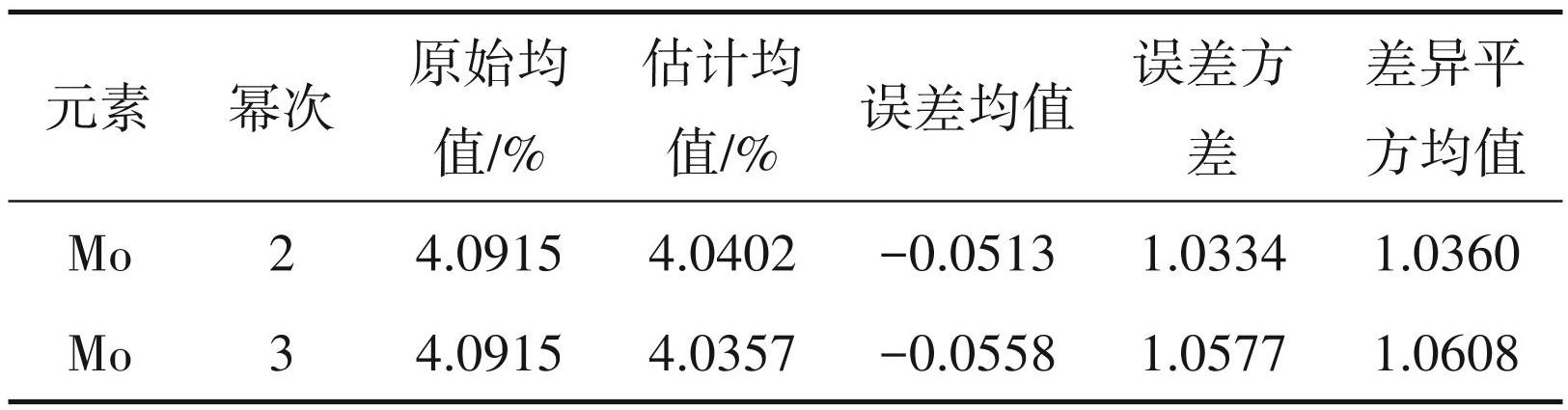 本文通过交叉验证确定各矿体估值幂次,在幂次 2. 0~3. 0 之间,选择估计均值和原始均值的差异均值趋近于“0”、差异方差和差异平方均值比值趋近于“1”的幂次,最终各矿体估算幂次确定为 2(表6)。