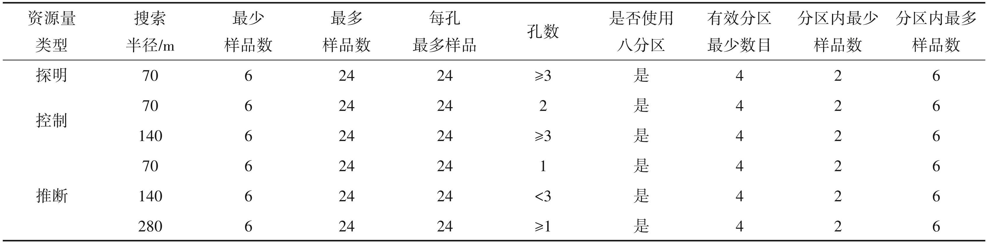 根据勘查规范(中华人民共和国自然资源部, 2020b),资源量分类应根据搜索半径、工程数、样品数等因素确定。而在实际操作中,往往第三个参数的作用被淡化,用前两个参数来划分资源量类型。