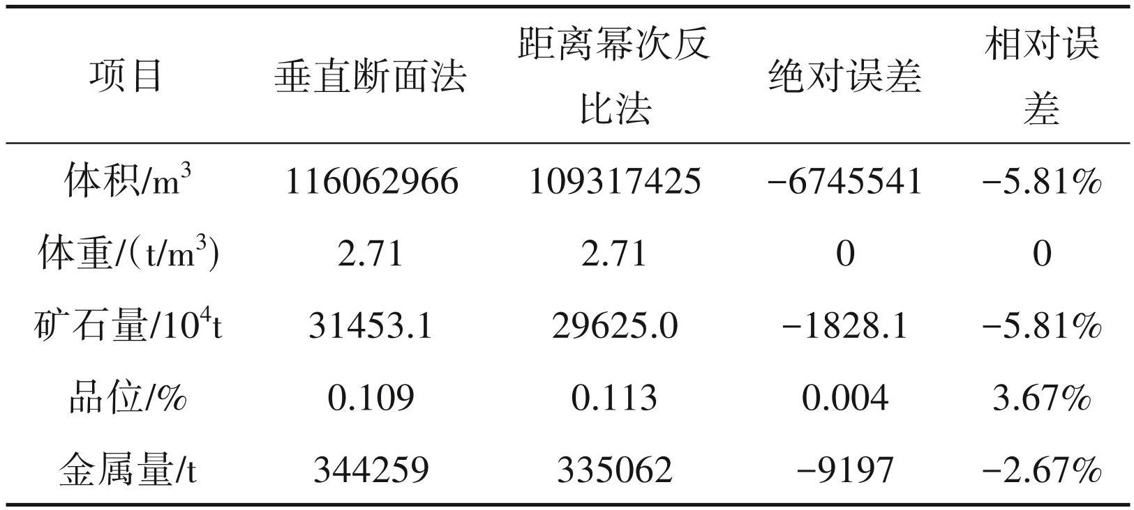 用平行断面法与距离幂次反比法得到的资源量结果进行验证,平行断面法求得东矿段主矿体资源量钼矿石量31453.1万t,金属量344259 t,平均品位0.109%,二者对比表见表8。