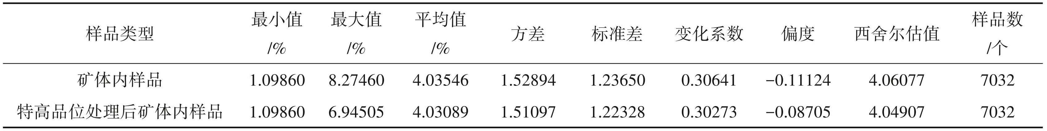 对特高品位处理后的合理性检验也是必须进行的一步工作(杨丰铭等,2022),经验证,处理后样品算数平均值略小于西舍尔估值,相比特高品位处理前(表2),二者数值更接近,同时偏度和变异系数进一步减小;处理后东矿段主矿体金属量损失量 18796 t,占处理前总金属量的 5.31%,说明特高品位处理结果合理。
