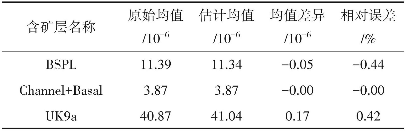 评价资源量估算结果可靠性,尤为重要的要验证品位估值的可靠性,将估值结果与原始值进行对比验证,利用二者的均值比较均值差异及程度是判断品位估值可靠性的常用方法之一。3个含矿层估值均值与原始均值之间差异在-0. 05 至 0.17 之间,各含矿层相对误差在-0.44% 至 0.42% 之间,相对误差均在±10% 以内,表明本次估算较为可靠。品位估值验证成果见表5。