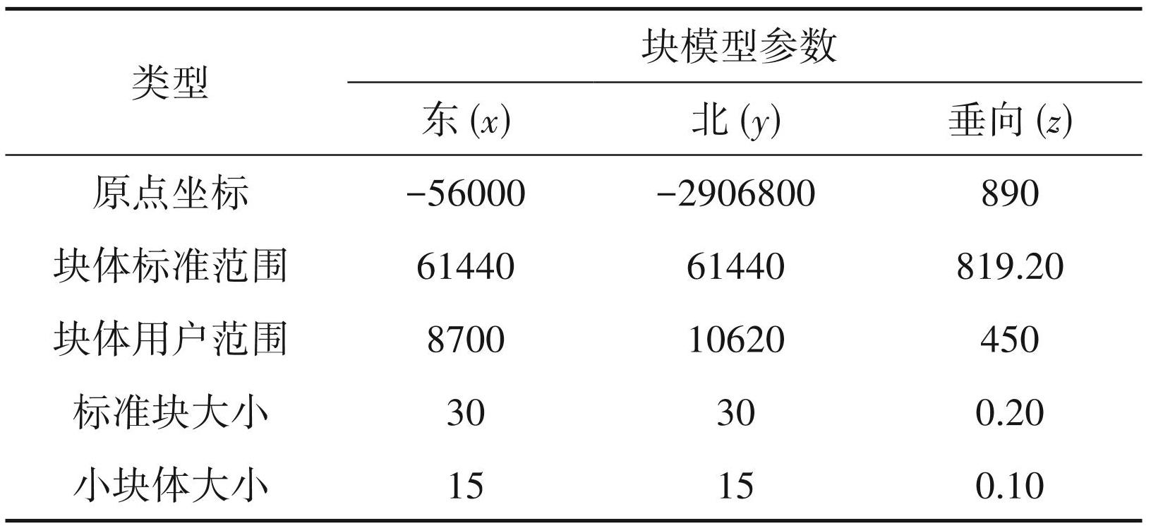 广泛采用的品位估值方法主要有距离幂次反比法和克立格法(张焱等,2011;周旋等,2015;彭正泉等,2017)。这些方法从数学上看,都是根据单元块周围一定范围内的已知样品点,对该单元块进行估值。一般估值领域的取值不超过变异函数的变程,然而,成矿元素其相对应的品位变异函数并不是一个模型构成,所以,估值领域的确定还需要参考矿体形态、勘探网等因素的影响(杨金富等, 2016)。本次估值采用的是距离幂次反比法,基本原理为任意空间位置的属性值与其领域内的属性值具有空间相关性(刘琳,2017;田玉川,2018)。本次估值幂次采用 2,估值参数依据工程控制程度及矿体产状特征确定。估值时,各矿化域利用各自样品点分别独立估算,估值分4次进行,每次扩大搜索半径并调整相关参数,估值详细参数见表3。