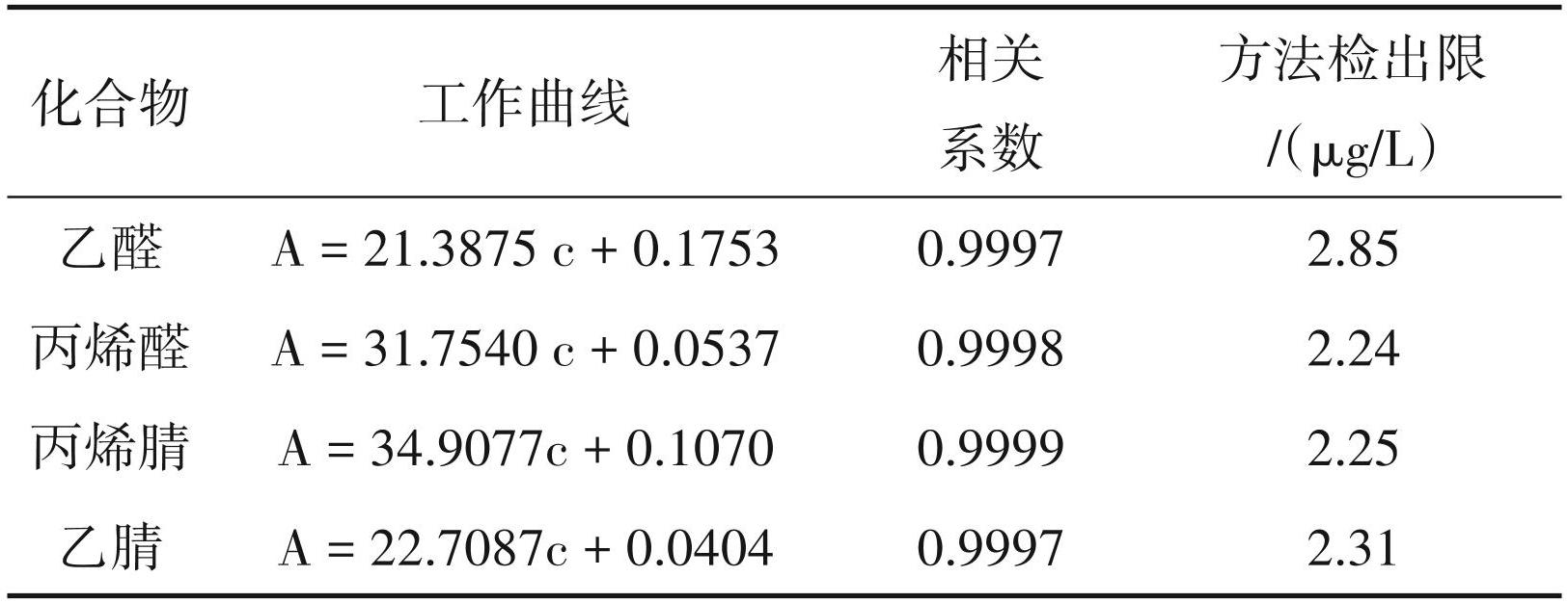 以浓度为横坐标,峰面积为纵坐标,外标法绘制工作曲线,工作曲线的线性良好,其相关系数r均在0.9995以上。根据《环境监测分析方法标准制修订技术导则》(HJ 168-2020)对方法检出限的要求。因样品中未检出被测物质,对浓度值为预估检出限值3~5倍的配置样品进行连续7次平行测定,计算7 次平行测定的标准偏差(S)及方法检出限(MDL),按照 MDL=t (n-1,0.99)×S(置信度为 99% 时,t=3.143)计算方法检出限,方法检出限为 2.24~2.85 μg/ L。(表1)。