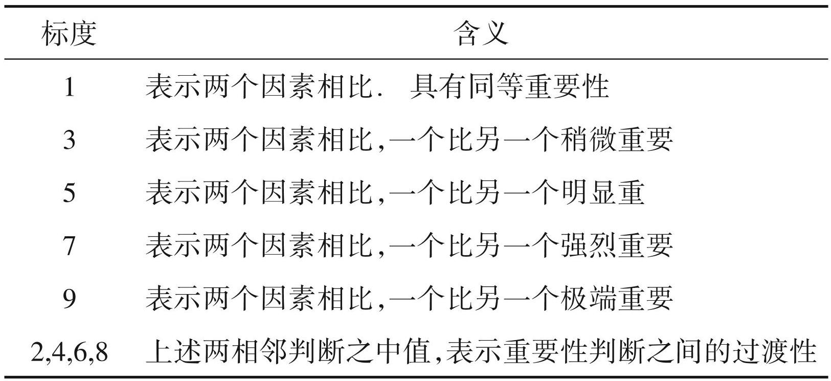 (1)确定判断矩阵。确定区域影响因素,根据主题层和指标层通过专家打分确定。期间要所有专家通过要求每个成员按 Saaty and Tran(2007)提出的1~9 标度(表1)两两比较后得出各自的判断矩阵,直至最后所有专家都没有意见为止,则求得的判断矩阵即为最终判断矩阵。