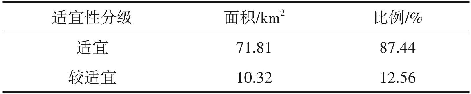 依据《城乡规划工程地质勘察规范》(2012),评定单元建设适宜性等级类别定量计算评判的判定标准按表5确定,由于本次选取的一级与二级因子的各自总数和均为 1,因此适宜性评分指数总分为 10分,与相应的标准减少一个数量级。