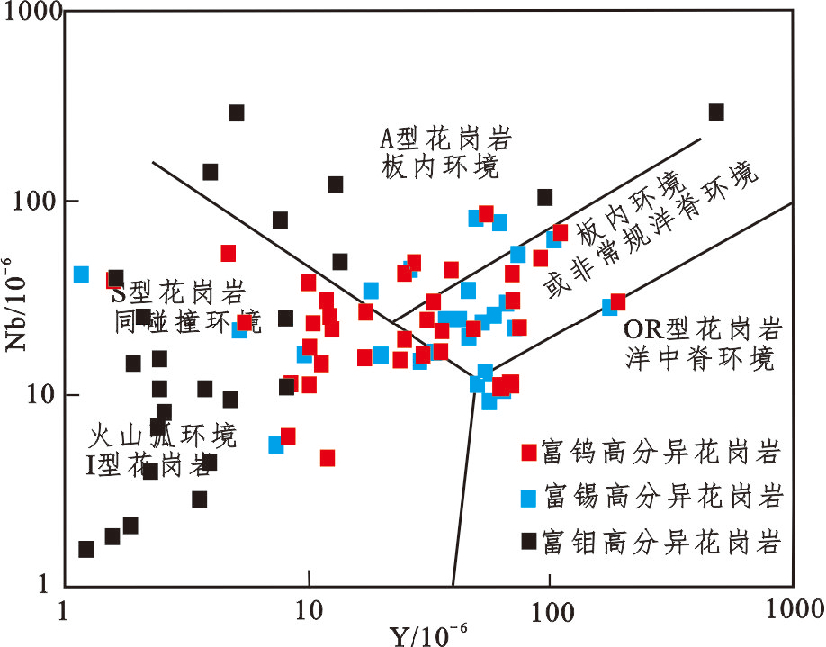 中国钨锡矿床具有分布广泛但相对集中的特点,80% 集中分布于华南地区,尤以南岭构造带最为集中;其次分布于昆仑—祁连—秦岭—大别褶皱系、天山—兴蒙褶皱系和西藏—三江造山带(蒋少涌等,2020)。钨锡矿床的可分为斑岩型(如江西阳储岭钨矿床、江西阳储岭钨矿床)、云英岩型(如江西阳储岭钨矿床)、矽卡岩型(如湖南新田岭钨矿床、内蒙古黄冈锡铁矿床)、石英脉型(如江西西华山钨矿床、广西珊瑚钨锡矿床)和硫化物型(如广西大厂锡矿床),石英脉矿床是钨矿的重要类型,而锡石硫化物型矿床是最具经济价值的类型(蒋少涌等,2020)。尽管钨锡矿床类型多样,但大部分都属于花岗岩岩浆及其热液流体构成的成矿体系,因此矿床分布与花岗岩体空间分布关系密切。成矿物质来源证据表明,钨矿床的成矿物质通常来源于高分异的强过铝质 S 型花岗岩,以二云母花岗岩及白云母花岗岩为主;锡矿床则以准铝质-弱过铝质黑云母花岗岩为主(蒋少涌等,2020)。中国钨成矿区带图(图7)显示,钨锡矿床分布范围较为一致。Y-Nb 图解(图8)显示,富钨高分异花岗岩 Y 值相对较高,可能与板内拉张环境有关;富钼高分异花岗岩较富钨、锡高分异花岗岩具有更低的 Y,Nb,表现出了更强的I型亲缘性。