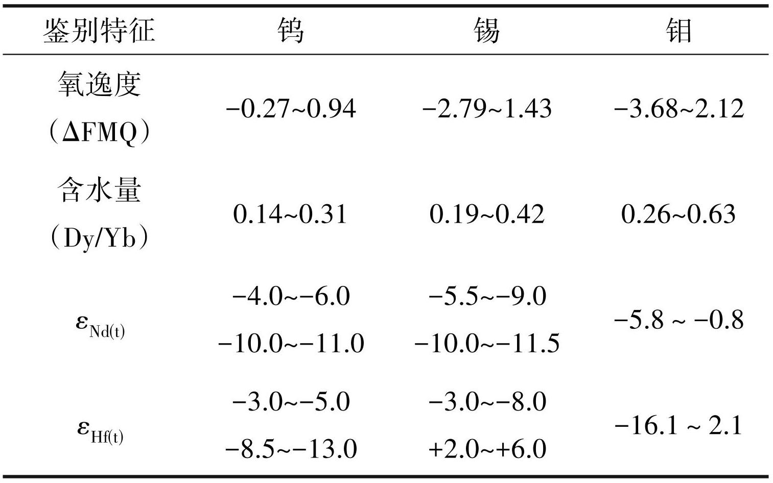 高分异花岗岩最终成钨(锡、钼)矿的类别受到了多方面因素的控制(表6)。有学者总结了含钨花岗岩和含锡花岗岩的物源特征,εNd(t)含钨花岗岩的 εNd(t)主要集中在-4.0~-6.0 和-10.0~-11.0,含锡花岗岩的 εNd(t)在−5.5~−9.0 和−10.0~−11.5(蒋少涌等, 2020),而含钼花岗岩的 εNd(t)主要集中在-5.8~-0.8 (朱玉娣,2014)。此外,含钨花岗岩εHf(t)主要集中在-3.0~-5.0 和-8.5~-13.0;锡花岗岩的 εHf(t)在-3.0~-8.0 和+2.0~+6.0(蒋少涌等,2020),含钼花岗岩的 εHf(t) 则是在-16.1~2.1(朱玉娣,2014)。