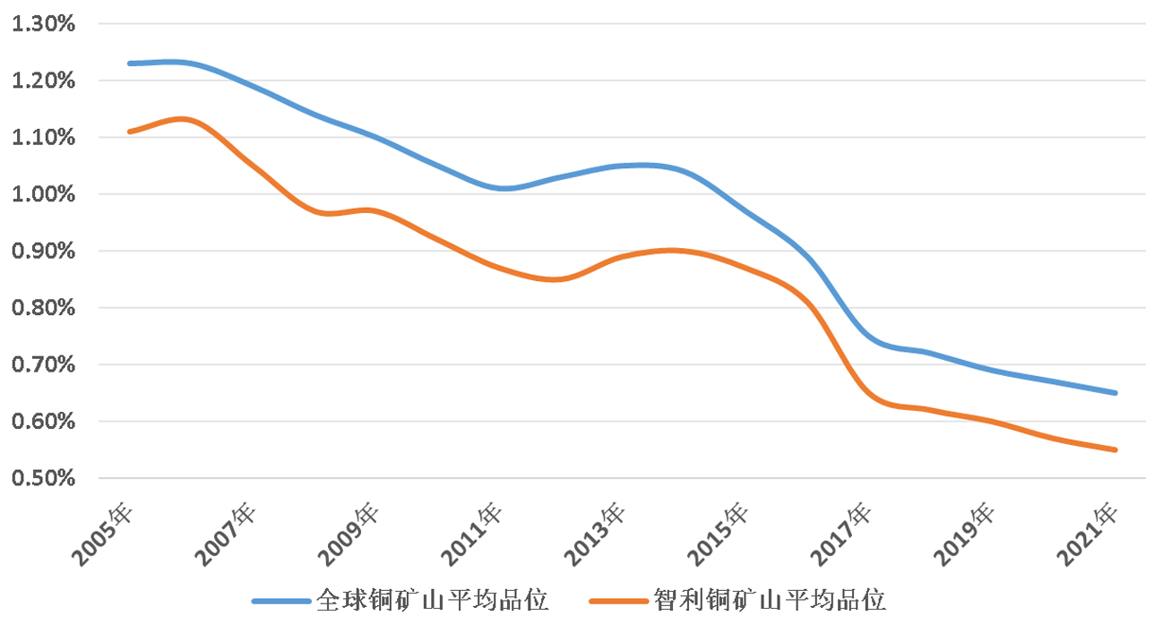 图3 全球、智利铜矿山平均品位历年变化趋势图
