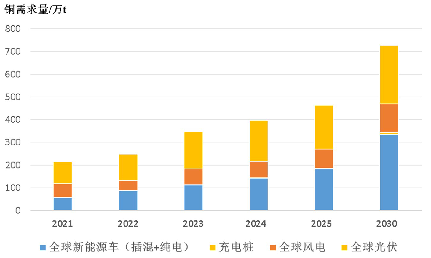 根据民生证券研究院测算数据,2024—2025 年,新兴领域(包括全球新能源车、充电桩、风电、光伏)合计对铜需求量分别为 397 万 t、463 万 t,2030 年或将达728万 t(图7)。