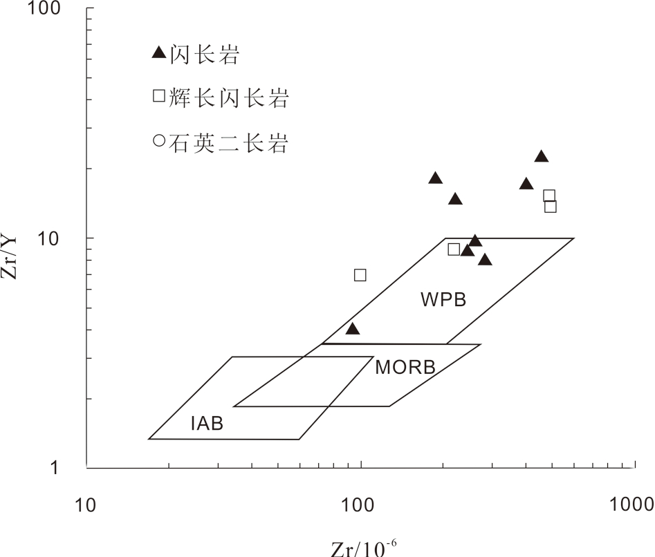 该岩体主量元素含量见表1,显示为中性—基性岩类。SiO2含量除一个为 66.86%外,其他样品含量集中于 48.89%~59.09%;Al2O3 含量介于 14.80%~18.22%,A/CNK为0.83~1.08,大多数属准铝质范围,仅一个样品(A/CNK 为 1.39)落入过铝质区域;全碱含量较高:Na2O+K2O 为 5.93%~9.00%,其中 Na2O 含量为 3.26%~5.22%,平均 3.98%,K2O 含量 1.31~5.00%,平均值为 3.20%;Na2O/K2O 为 0.80~4.00,仅两个小于 1,为钠质岩石;MgO含量介于 1.01%~6.25%,Mg# 变化于 36~61,其中 Mg# = 100×n(Mg)/[n(Mg)+n(TFe)](邓晋福等,2015);TiO2= 0.68%~2.67%,平均为 1.65%,接近洋岛玄武岩的 TiO2 含量(1.35%~2.29%)(Weaver,1991);在侵入岩 TAS 图解(图3)上,辉长闪长岩落在碱性区域的二长闪长岩及二长岩范围内,闪长岩则主要落入Ir-Irvine 分界线下方的二长岩范围,仅一个投在石英二长闪长岩,与矿物组成定名相符;野外观测及薄片鉴定结果表明,岩体遭受了不同程度的后期蚀变作用,且样品岩石化学分析数据中具有较高的烧失量(LOI 值介于 1.16%~6.37%),因此,在岩石类型判别中纳入不活泼的微量元素(如 Zr、Nb、Y、Ti)做进一步判别,Nb/Y-10000×Zr/TiO2岩石分类图(图4) 上,样品点主要落入碱性玄武岩-粗安岩区,仅石英二长岩落在粗面岩区。二者判别结果较为一致,说明蚀变在岩石化学定名方面影响较小。