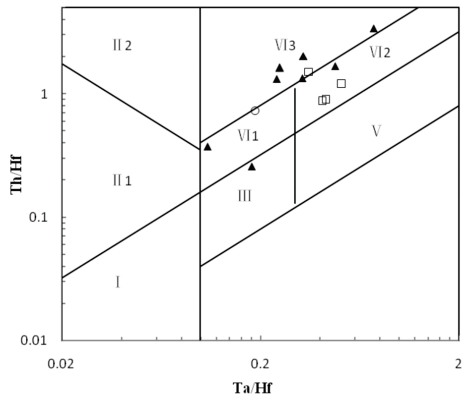 TNT 异常(Nb、Ta、Ti 亏损)通常被作为岛弧和活动大陆边缘玄武岩的典型标志(Pearce,1982; Keppler,1996;夏林圻等,2007),但出现Nb、Ta、Ti异常并不一定代表岛弧环境(赵振华,2007),亦可能是受到地壳的混染所致(Rudnick and Fountain, 1995;胡培远等,2016),敦达乌苏辉长闪长岩与闪长岩不相容元素 Nb、Ta均相对亏损,显示消减带或地壳混染的特征,但较高的 TiO2(0.68%~2.67%)、 Nb(12.77×10-6~50.29×10-6)、Ta(0.82×10-6~3.60× 10-6)含量明显高于典型的岛弧岩浆,且样品 Nb、Ta 的亏损程度呈逐渐减弱趋势,可能与混染程度逐渐降低有关。夏林圻等(2007)认为岛弧玄武岩具低的 Zr 含量(<130×10-6)和 Zr/Y 值(<4),而大陆玄武岩,不管是否遭受地壳或岩石圈混染,它们均具有较高的 Zr 含量(>70×10-6)和 Zr/Y 值(>3),研究区样品 Zr(93.4×10-6~499.3×10-6)值和 Zr/Y(4.1~27.5) 值表明辉长闪长岩并非来源于岛弧环境。(Th/Nb)N 值((Th/Nb)N<1)与 Nb/La 值(Nb/La≥1)是识别岩浆没有受到地壳混染的两个特征参数,样品中(Th/Nb)N 值介于 0.67~3.79(平均 2.21),Nb/La 值介于 0.43~0.81,显示出陆壳物质混染的特征。前人研究表明 (夏林圻等,2007;程银行等,2015),具陆壳混染特征的基性岩浆用(Zr/Y)-Zr图解(图11)可以更好地区别板内玄武岩与岛弧或大陆边缘玄武岩,测区样品点主要落在板内玄武岩区及其附近;在 TiO2-Zr 构造判别图解(图12)上,多数样品点均落于板内玄武岩区域,仅一个样品落入岛弧区域;(Ta/Hf)-(Th/ Hf)图解中样品点主要落到陆内裂谷碱性玄武岩区及大陆拉张带玄武岩区(图13);在(Nb×2)-(Zr/4)-Y 图解(图14)中,二者样品点主要投到板内碱性玄武岩(A1+A2)中及其附近,表明它们具有板内拉张环境的特征。
