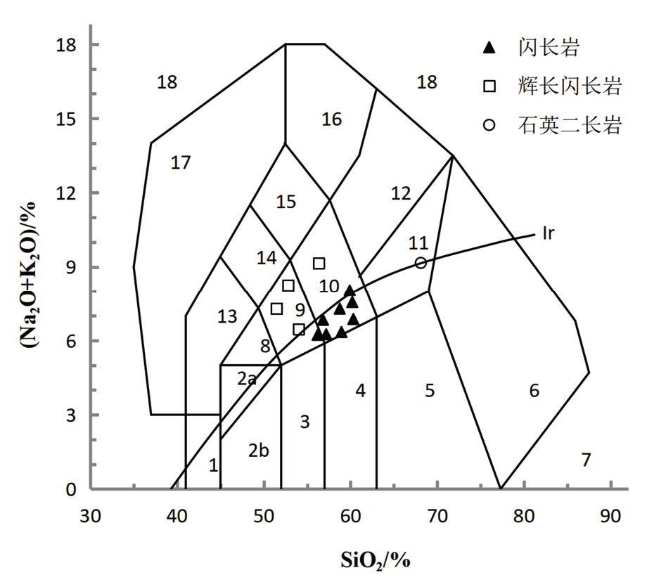1—橄榄辉长岩;2a—碱性辉长岩;2b—亚碱性辉长岩;3—辉长闪长岩;4—闪长岩;5—花岗闪长岩;6—花岗岩;7—硅英岩;8—二长辉长岩;9—二长闪长岩;10—二长岩;11—石英二长岩;12—正长岩;13— 副长石辉长岩;14—副长石二长闪长岩;15—副长石二长正长岩; 16—副长正长岩;17—副长深成岩;18—霓方钠岩/磷霞岩/粗白榴岩