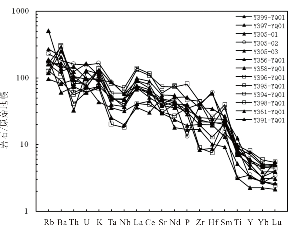 在原始地幔标准化的蛛网图(图5)上:LILE 以 Rb、Ba、K、Pb、Sr富集;HFSE中Nb、Ta、Th相对亏损。整体呈“隆起”状多元素原始地幔标准化配分特征,除 Nb、Ta 元素相对亏损外,与洋岛玄武岩(OIB)或板内玄武岩的特征相似,而不同于典型火山岛弧背景下的岩石特征。样品 Y/Nb 值为 0.39~1.12,平均值0.77,与碱性洋岛玄武岩及大陆玄武岩Y/Nb值小于1的变化范围相同。其高的Zr(93.4×10-6~499.3× 10-6)值和 Zr/Y(4.1~27.5)值,显示与板内玄武岩特征更为相近。