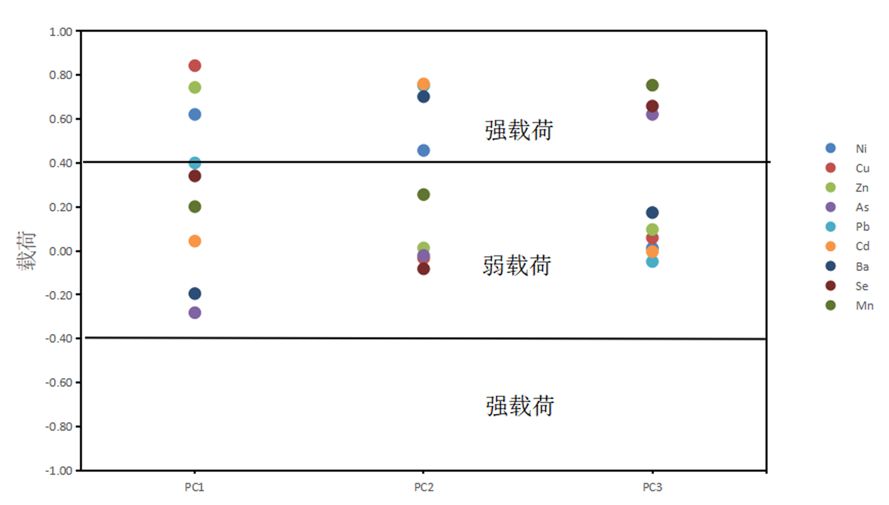 主成分 1(Ni、Cu、Zn)中 Ni、Cu、Zn 可能有着相同的来源,考虑到采样点位分布,判断主成分1主要与交通及农业有关,主成分 2(Pb、Cd、Ba)中 Pb、Cd 可能有着相同来源,由于 Pb、Cd含量大部分低于国家I类标准,可以认为Pb、Cd为自然源,Ba大部分点位符合国家 II 类标准,少部分符合 III 类标准,推测大部分为自然因素影响,少部分受排放影响,主成分2主要受自然因素和地质背景影响,主成分3(As、 Mn、Se)中Mn和Se可能有着相同的来源,Mn主要受地质背景影响,As含量可能受到农业活动和人类活动的影响,推测主成分 3 可能同时受人类活动和自然因素影响。