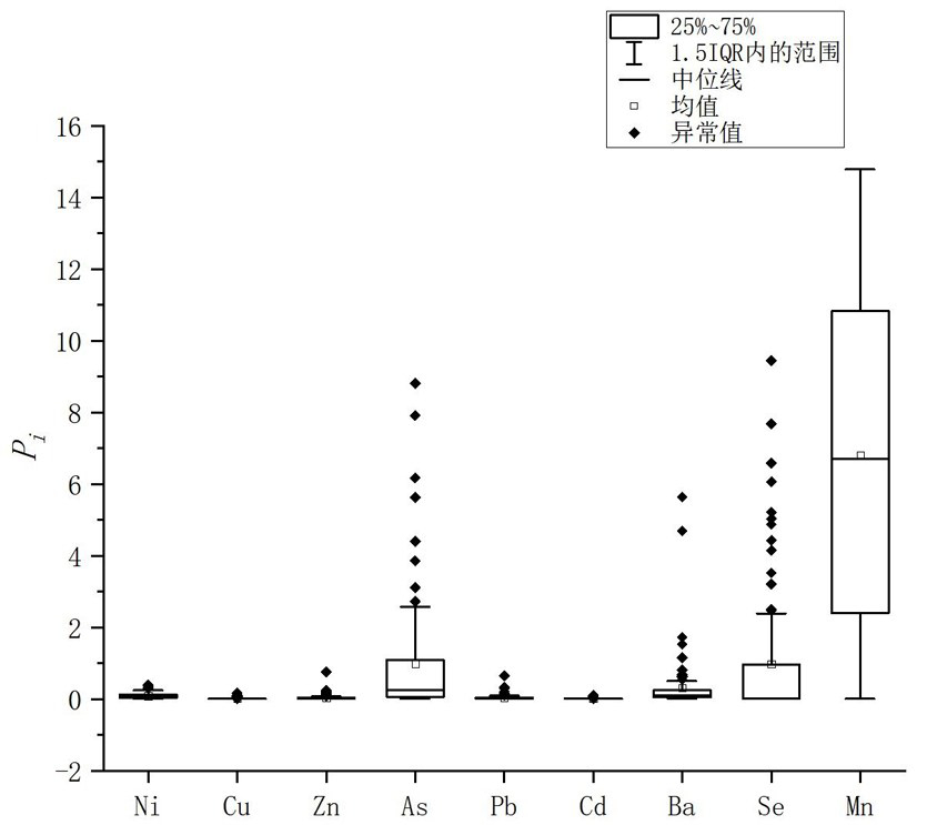峰度排序,Zn>Ba>Pb>Cd>Cu>As>Se>Ni>Mn。除 Mn 外所有峰度均>0,说明大部分数据分布峰态比正态分布陡峭(高尖),而 Mn 的数据分布峰态比正态分布平缓(平峰或低峰)。Zn 峰度明显大于其他重金属元素,这说明Zn浓度中离群值最多。