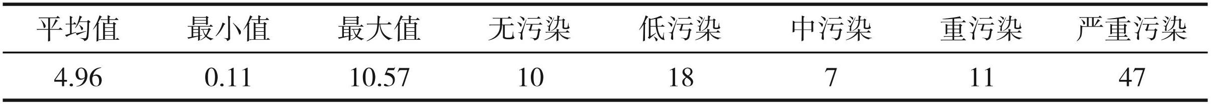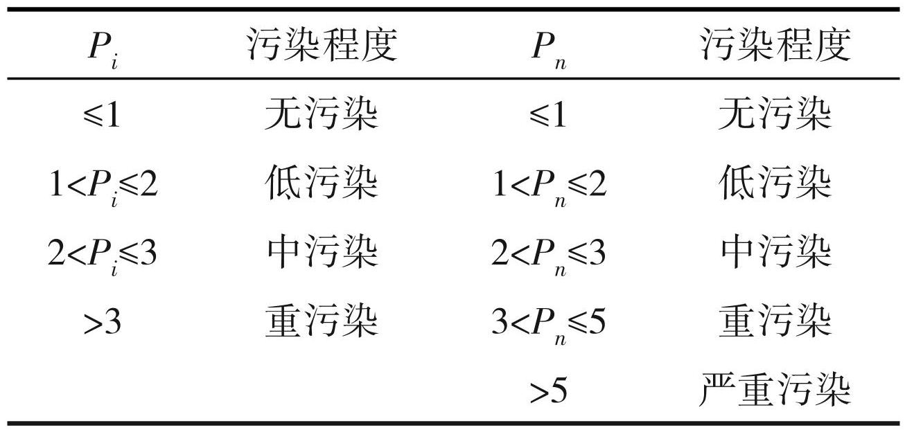 单因子和多因子评价标准如表1所示,一般综合污染指数小于或者等于 1 表示未受污染,大于 1 则表示已受污染,计算出的综合污染指数的值越大表示所受的污染越严重。
