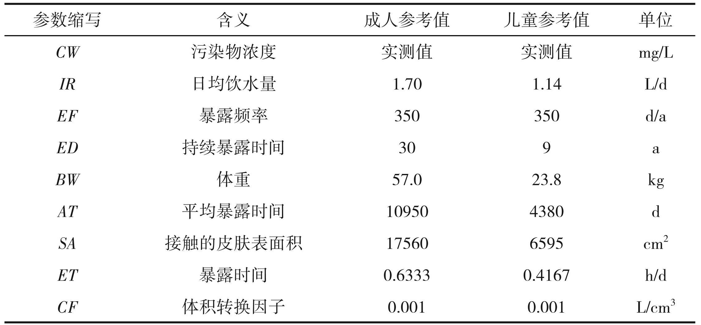式(4~5)中,LADDoral和 ADDoral分别为饮用途径下的致癌和非致癌性污染物的日均暴露剂量(mg/ kg·d);LADDderal和ADDderal分别为皮肤接触途径下的致癌和非致癌性污染物的日均暴露剂量(mg/kg·d),参数选择如表3所示。