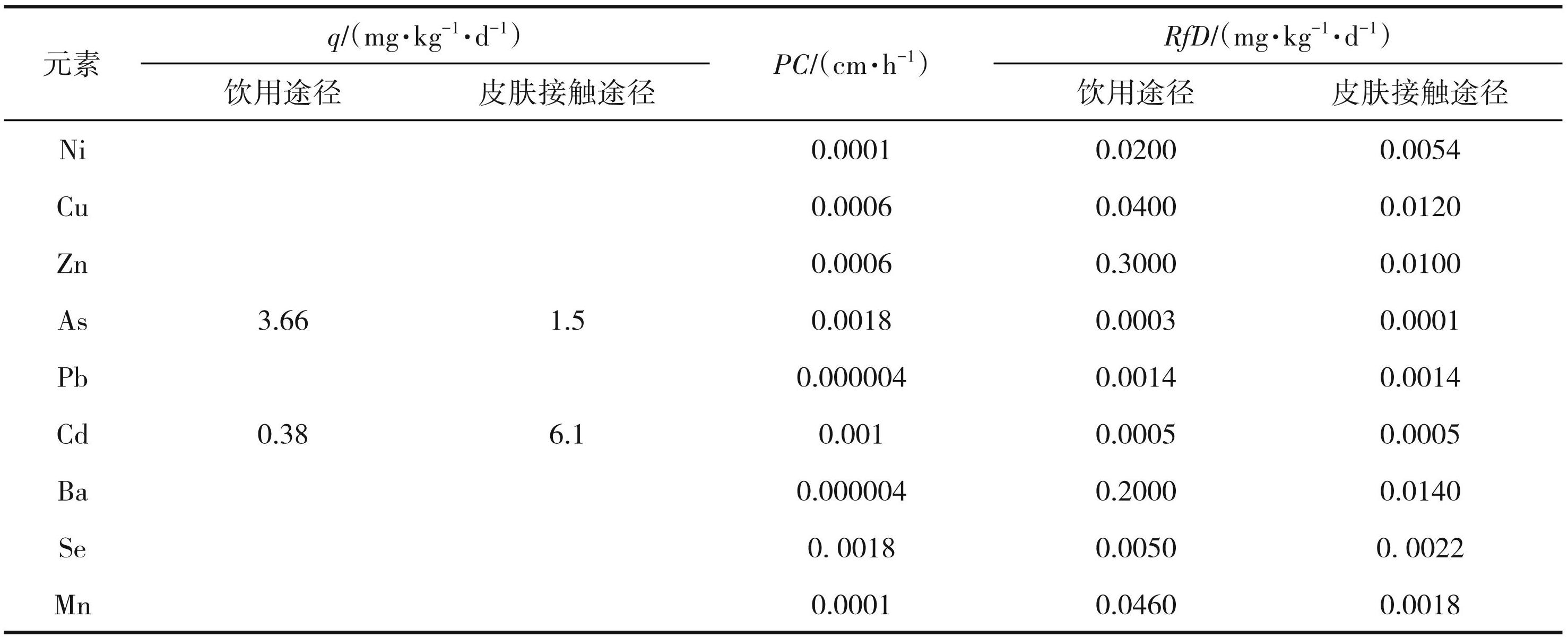 式(7~8)中,ADD 为非致癌物质的日均暴露剂量(mg·kg-1 ·d-1);RfD为非致癌物在不同暴露途径下的日均参考剂量(mg·kg-1 ·d-1);HI 为不同暴露途径下的非致癌综合风险值。根据USEPA分级,当HI< 1 时,非致癌风险处于可接受范围;当 HI>1 时表明非致癌物质对人类健康有潜在不利影响,存在非致癌风险。各重金属的q值和RfD值见表4。