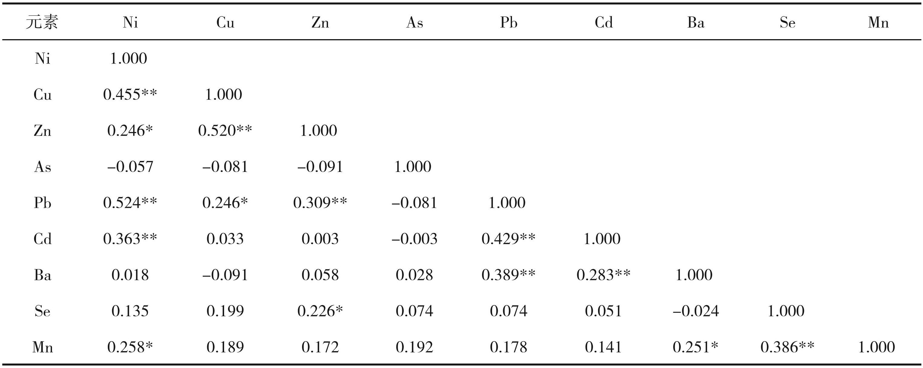 (4)相关性分析显示,研究区内多组重金属元素之间有着相关性,Ni-Pb、Cu-Zn、Ni-Cu、Pb-Cd这 4 组重金属中等程度相关,Ni-Cd、Pb-Zn、Pb-Ba、 Cd-Ba、Mn-Se这 5组重金属存在弱相关性,As与其他重金属元素之间相关系较弱,可能存在不同来源。