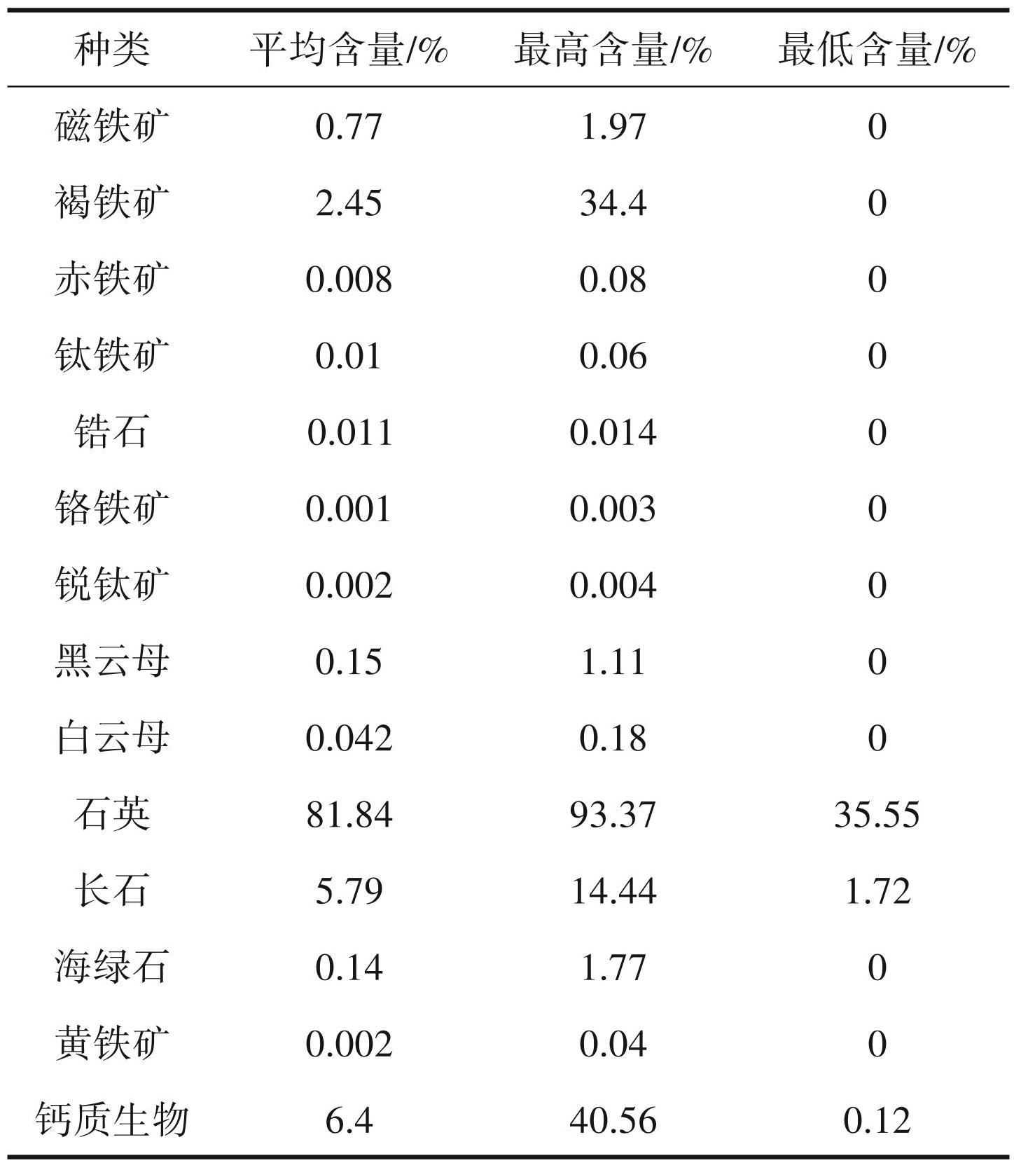 (2)钻孔碎屑矿物包括生源矿物、轻矿物、重矿物和自生矿物。生源矿物主要为钙质生物。轻矿物主要为石英、长石。重矿物种类较多,包括黑云母、白云母、黑色矿物(褐铁矿、赤铁矿、磁铁矿、钛铁矿)、锆石、锐钛矿、铬铁矿等。