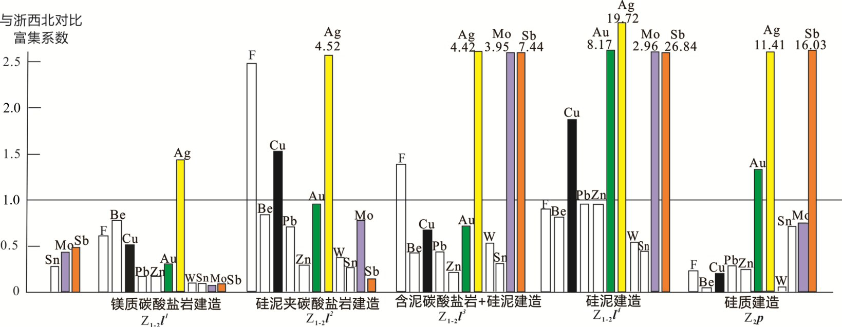 区内震旦系—寒武系碳酸盐岩建造上、下层位常发育大量炭硅泥岩建造,且部分碳硅泥岩建造与碳酸盐岩建造呈间变沉积,尤以蓝田组和大陈岭组最为发育。对于这种岩性间变沉积特征的成因目前有两种观点,一种认为是正常沉积环境的改变,另一种认为受小规模海底热液活动的影响(赵国连,2008;黄彬等,2013;陈立泉等,2023),热液活动的发生引发了 Cu、Pb、Zn、Ag 等金属元素初步富集与矿化,对接触交代型矿床的成矿具有很大的贡献。前人研究认为,接触交代型矿床的成矿物质主要来源于围岩或岩浆热液,若围岩含有较高的成矿金属元素,将成为矿源层,为矿床成矿提供大量的成矿物质(陈艳和张招崇,2012)。通过区内蓝田组地层中成矿元素含量对比分析,炭硅质泥岩建造中的成矿元素含量远高于碳酸盐岩建造(图13),可能是重要的矿源层。当岩浆热液沿构造、裂隙、节理等运移时萃取炭硅质泥岩建造内部的成矿元素,而与碳酸盐岩建造接触交代沉淀成矿。