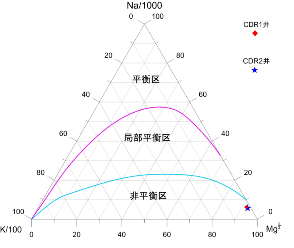 图4研究区CDR1井、CDR2井水样Na-K-Mg三角图