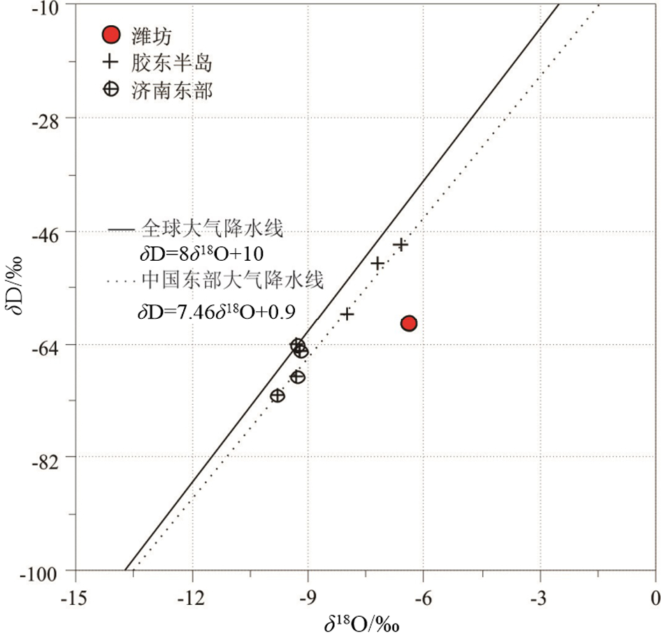 根据氢氧同位素测试分析结果,研究区 CDR1 井地热流体中 δD 值为-60.52‰,δ18O 值为-6.41‰,将该组数据与张杰等(2019)在胶东半岛和薛磊等 (2020)在济南东部取得的地热流体氢氧同位素数据进行对比分析,绘制氢氧同位素关系图(图5)。经综合分析,山东五里地区数据点落于大气降水线之下,且略偏离大气降水线,发生了“氧漂移”现象。