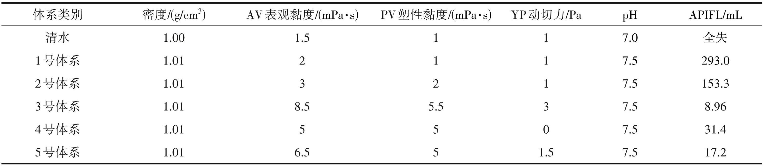 本研究共设计出了5种无固相聚合物钻井液体系(表7)。其中,KPAM 为聚丙烯酰胺钾盐,属强抑制剂,主要提高体系的抑制能力,PAC(Lv)和 PAC(Hv)分别为低黏和高黏聚阴离子纤维素,能有效的降低钻井液的滤失量。FA367为两性离子聚合物包被剂,起抑制岩屑分散和增加钻井液黏度的作用。