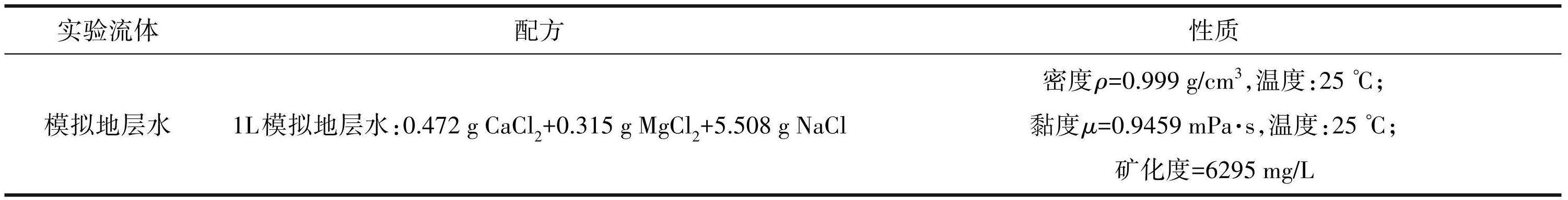 实验流体主要为模拟地层水,是根据实际地热水矿化度配制的标准盐水。研究区地热水的矿化度为 505~6294.6 mg/L,平均矿化度为 3978.5 mg/L,考虑到研究区热储岩石黏土矿物含量普遍较高,为避免矿化度较低时引起的水敏损害,研究选择最高地热水矿化度 6294.6 mg/L 作为模拟地层水的矿化度。配方组成及性质如表3所示。
