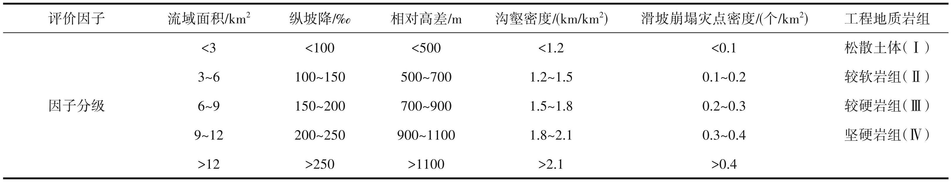 由于本区属于中国西南高植被覆盖区,植被覆盖率均较高,未能体现因子的贡献值高低,因此本文未选取植被因子;另外,降雨量主要在危险性评价阶段作为激发因子进行评价,在易发性评价中并未选取。因此,本研究选取流域面积、纵坡降、相对高差、沟壑密度、工程地质岩组、滑坡崩塌灾点密度 6 个影响因素作为小流域泥石流的评价因子;选取的各评价因子之间无强相关性,符合地质灾害评价因子选取要求。在分析各类型地质灾害发育情况与各孕灾地质条件因子区间分布特征的基础上,根据自然断点法,划分出 29个次级因子(表2)。开展红层泥石流易发性评价,在分析各类型地质灾害发育情况与各孕灾地质条件因子区间分布特征的基础上,将各评价因子进行次级区间划分。