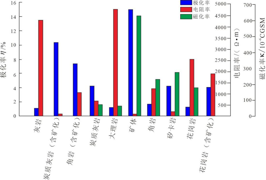矿区地质体主要为灰岩、炭质灰岩、大理岩、角岩、花岗岩体、矿体(主要指方铅矿、闪锌矿、黄铜矿矿体,多伴生磁铁矿、磁黄铁矿,基本上赋存于矽卡岩化带内),其中炭质灰岩由于其含炭的原因表现出低电阻率、高极化率和低磁化率,角岩主要呈现中电阻率、低极化率、中磁化率特征,灰岩、大理岩特征类似,呈现出高电阻率、低极化率、低磁化率特征,花岗岩主要呈现出高阻率、低极化率、中低磁化率特征。当围岩中含有矿化时,则电阻率会有所降低、极化率和磁化率会有所升高。矿体则表现出低阻率、高极化率、高磁化率的特征。