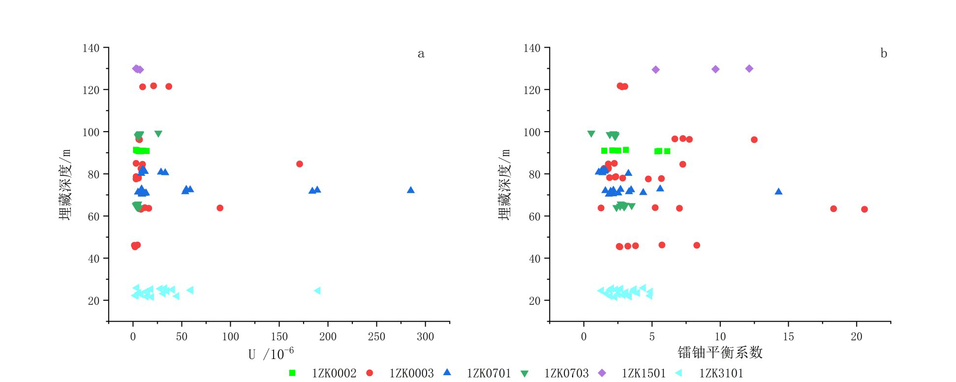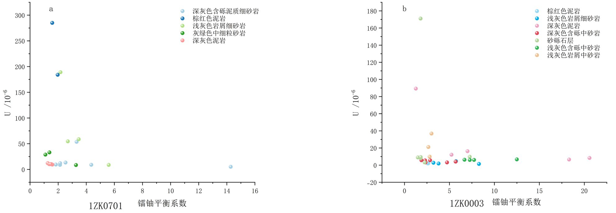 1ZK0003 号钻孔采集分析样本 30 件,1ZK0701 号钻孔采集分析样本 21 件,1ZK0003 号钻孔含矿层,品位大于 0.01% 矿层,泥岩及砂砾石层镭-铀平衡系数均小于2,深灰色细粒含砾砂岩、深灰色中粒含砾砂岩及浅灰色中粒岩屑砂岩镭-铀平衡系数处于 2~3,矿层与上下盘围岩体现出明显的“v”趋势。 1ZK0701号钻孔含矿两层,第一层为棕红色泥岩,在品位大于 0.01% 矿层处镭-铀平衡系数均小于 2,围岩多大于3,第二层矿层所处泥岩镭-铀平衡系数均小于2,上部含砂围岩则从上至下由5.6逐渐降至与矿层一致(图7)。