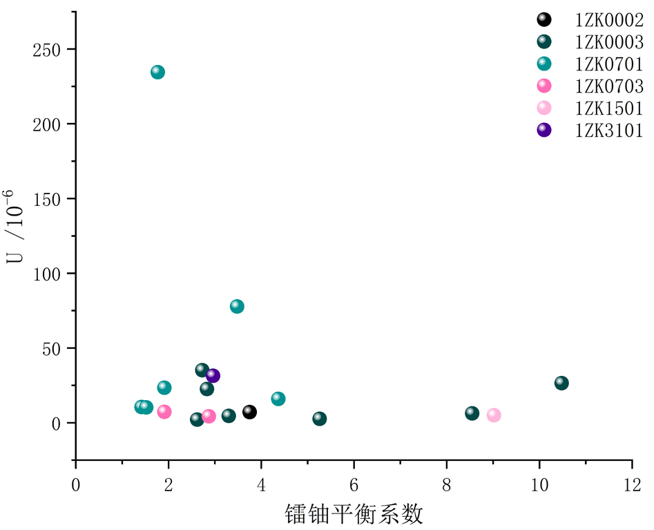 图9矿层U-镭铀平衡系数散点图