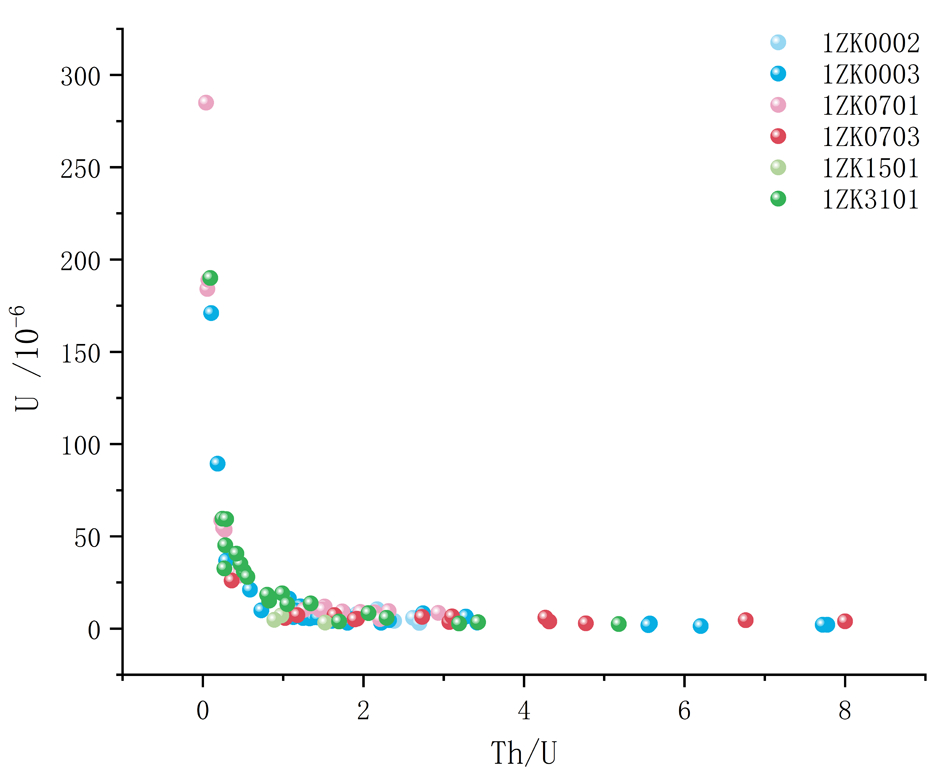 区内棕红色泥岩-深灰色泥岩-砂砾石层-浅灰色中粒岩屑砂岩所组成的红色—灰绿色碎屑岩系为铀的富集提供了氧化还原环境,该层稀疏结构为铀水的迁移及铀的富集提供了空间(胡珺珺等, 2011;周琪等,2021),通过样品 Th/U 比值分布与红色碎屑岩系的展布情况,显示了准噶顺一带铀在NE 向的富集。通过 U 与 Th/U 散点图(图3)可以看出, U 的高值主要分布在钻孔 1ZK0003、1ZK0701、 1ZK3101,显示区域主要在基线的北侧的北东方向。
