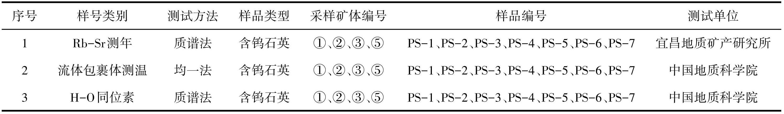 本文针对①、②、③、⑤等 5 个钨矿体共采集样品21件,其中Rb-Sr测年样品7件、流体包裹体测温样品 7 件、H-O 同位素测试样品 7 件,Rb-Sr 测年在宜昌地质矿产研究所完成,流体包裹体测温和 H-O 同位素测试在中国地质科学院完成。各样品编号及测试方法如表1所示。