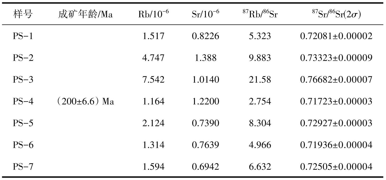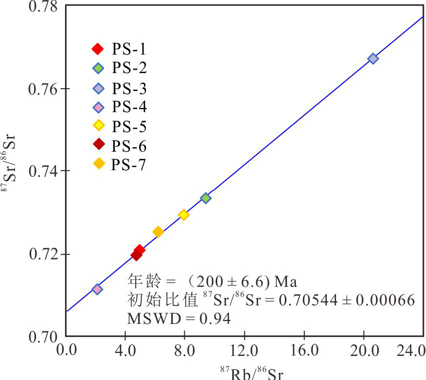 沿河钨矿床含钨石英脉石英流体包裹体Rb、Sr 同位素分析结果显示(表2),样品中 Rb(10-6)、Sr (10-6)含量分别为 1.164~7.542、0.6942~1.388; 87Rb/86Sr 值变化范围较大,为 2.754~21.58;87Sr/86Sr (2σ)值较集中,为 0.71723~0.76682,PS-1~7 获得的等时线年龄为(200±6.6) Ma(MSWD=0.94),87Sr/86Sr 初始比值为 0.70544(图6)。结合流体包裹体岩相学和宏观特征,所测样品中流体包裹体主要为原生包裹体,Rb-Sr 等时线年龄代表了含钨石英脉的形成年龄。