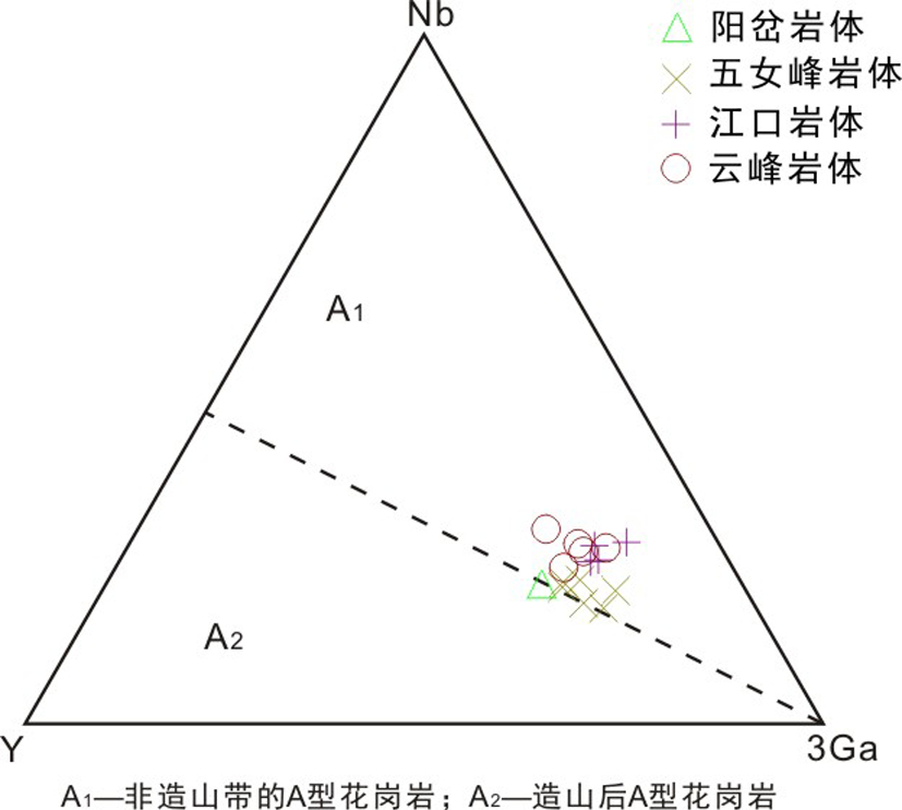 A型花岗岩的实质是在低压条件下部分熔融形成的花岗岩类,大多产于地壳伸展-减薄的构造背景中(蔡剑辉等,2006;张旗,2013),将其进一步分为 A1、A2两个亚类(Eby,1990),其中 A1型花岗岩形成于非造山环境,A2型花岗岩形成于造山后环境。在Nb−Y−3Ga构造环境判别图解中(图8),样品的投点均在 A1型花岗岩区域内,表明 4处岩体均属于 A1 型非造山带的A型花岗岩。