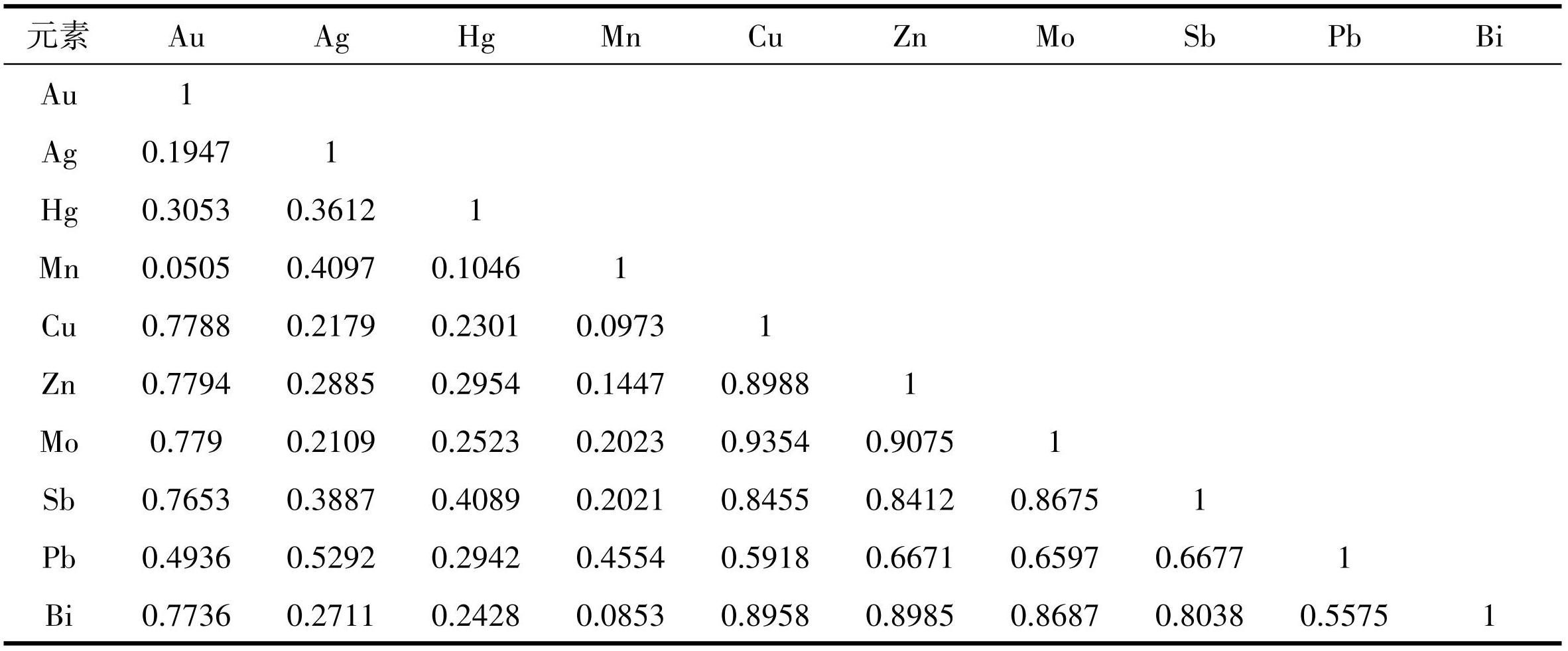 通过使用SPSS软件对测试数据进行KMO检验和巴特利特检验,KMO检验值为0.771,接近1,表示适合做因子分析;巴特利特检验是为了检验数据是否来自于正态分布,巴特利特球度检验显著性为 0.000,小于 0.001,表示数据来自于正态分布,适合进一步分析(董一博等,2019)。通过因子相关性分析表明:Cu与Au呈显著相关;Zn与Au、Cu呈显著相关;Mo 与 Au、Cu、Zn 呈显著相关;Sb 与 Au、Cu、Zn、 Mo 呈显著相关;Pb 与 Ag、Cu、Zn、Mo、Sb 呈显著相关;Bi与Au、Cu、Zn、Mo、Sb呈显著相关(表2)。以上元素相关性特征指示,Cu、Zn、Mo、Sb、Pb、Bi成矿可能与中—低温热液活动密切相关,且受高温热液活动影响,同时与 Pb 和 Zn 相关性较强的元素为 Au、 Ag、Cu、Zn、Mo、Sb,这些元素可作为铅锌找矿的指示元素。